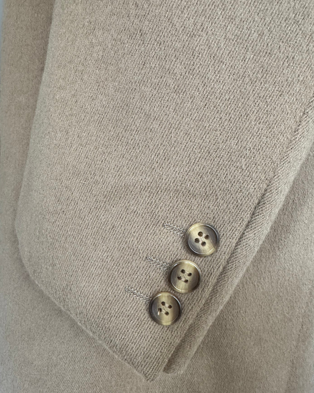Vintage camel Italian wool overcoat. Soft brushed wool twill finish. 2 hip pockets. Pick stitch detailing along collar and pockets. 3 buttons at each cuff. Fully lined. Internal left breast pocket. Center back slit at hem.