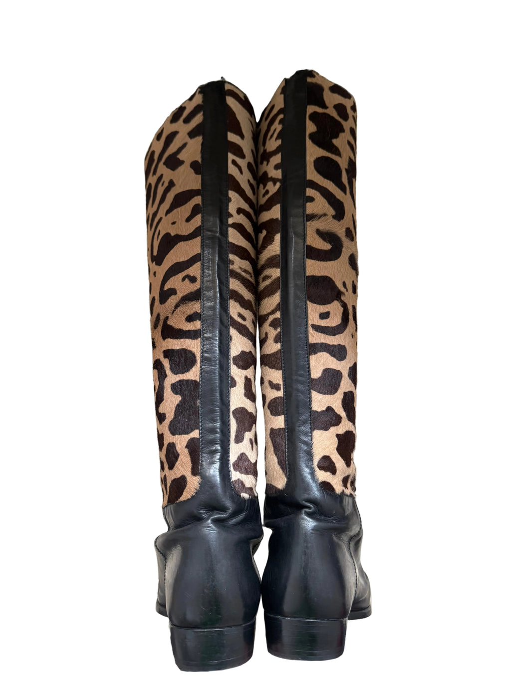 Maud Frizon pony hair and black leather boot. The beige and dark brown pony hair shaft is printed to look like ocelot. The boot features a black leather upper with a black leather strip running up the back. Leather sole with new Vibram heel.