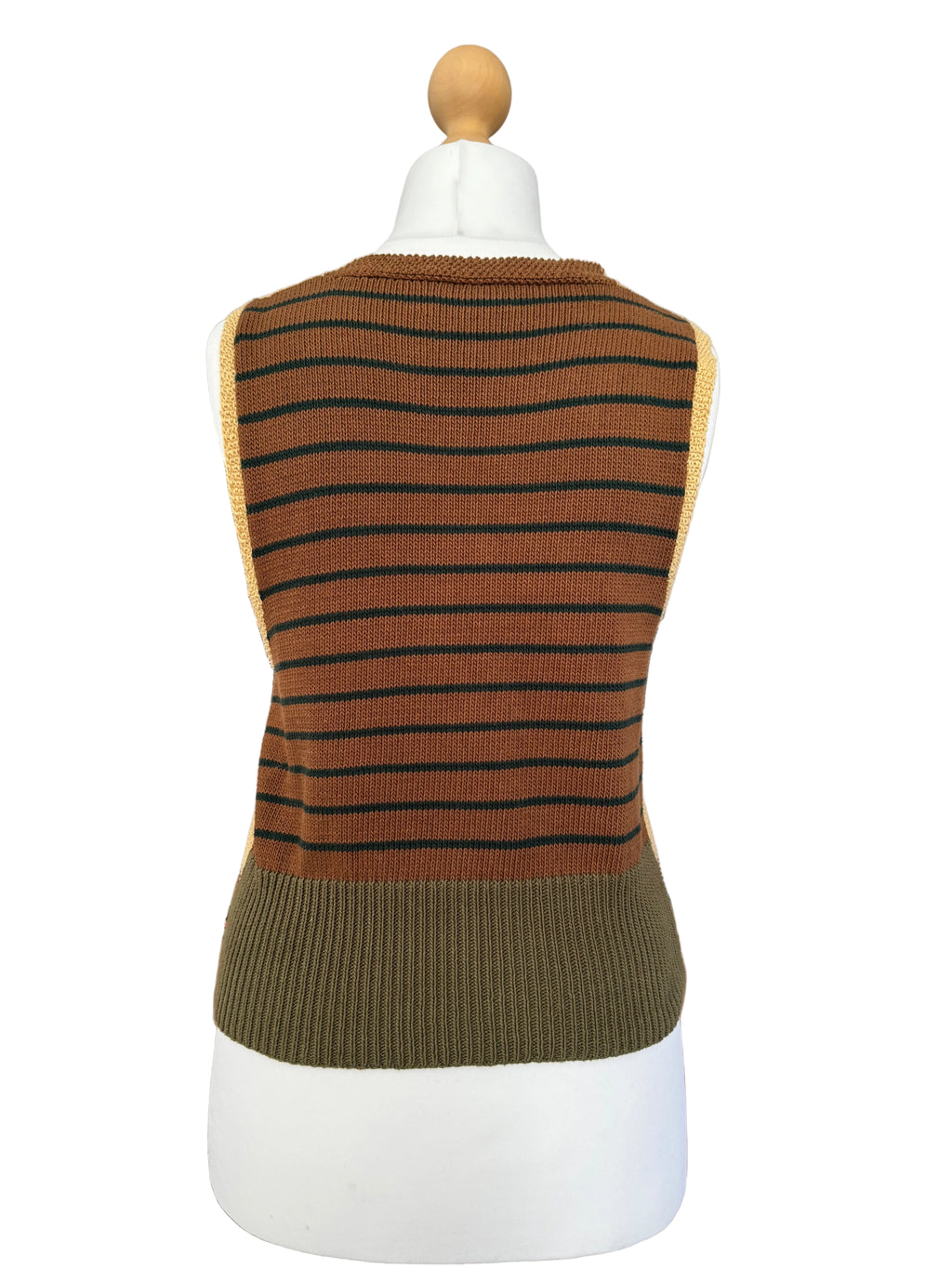 Vintage Lauren by Ralph Lauren hand-knit cotton v-neck vest. Beige, grey, brown, rust, and navy blue stripes. Unique 3-pocket design with 1 pocket at the left front waist and 2 hip pockets. Tonal brown buttons. 100% cotton.