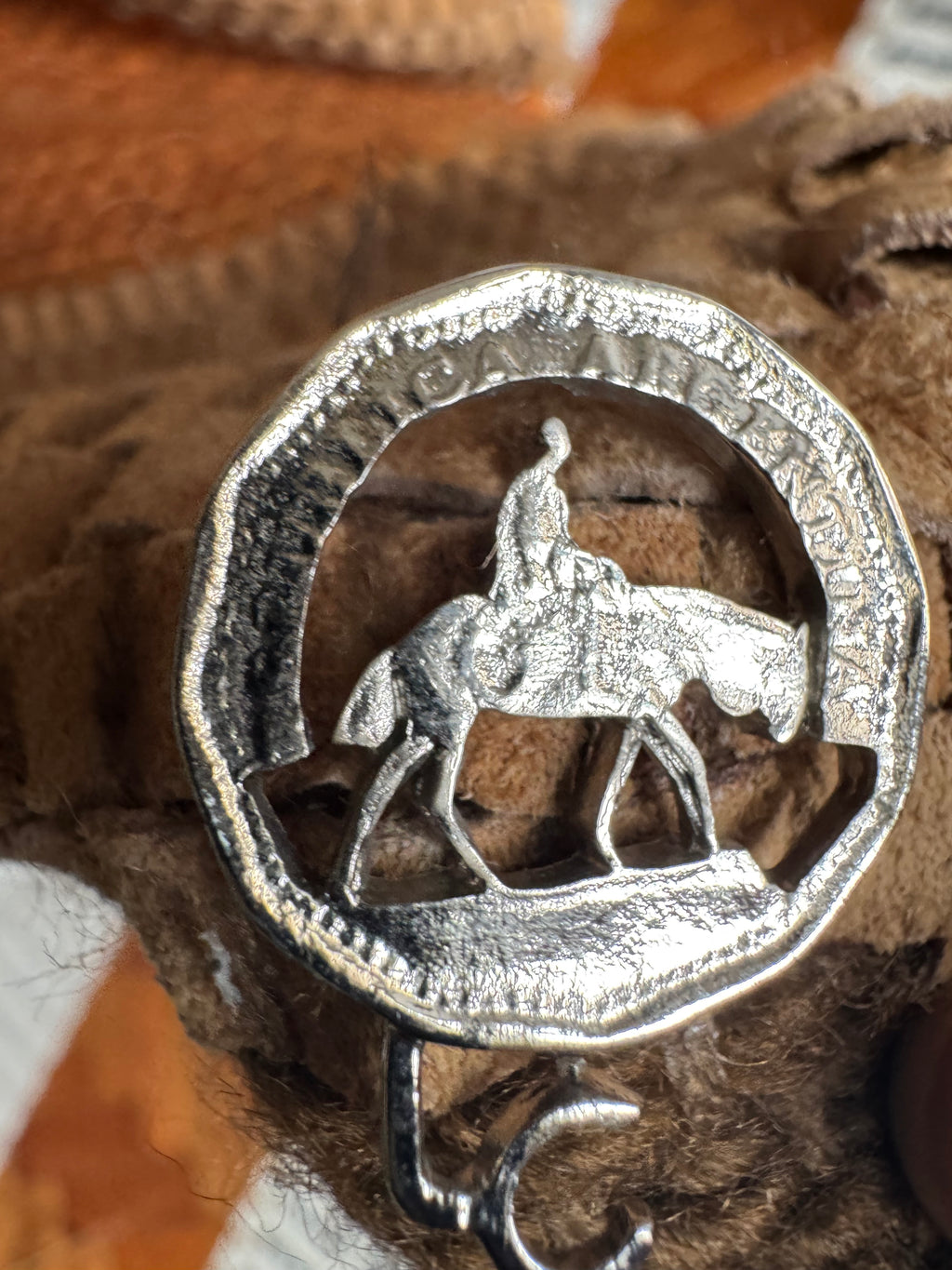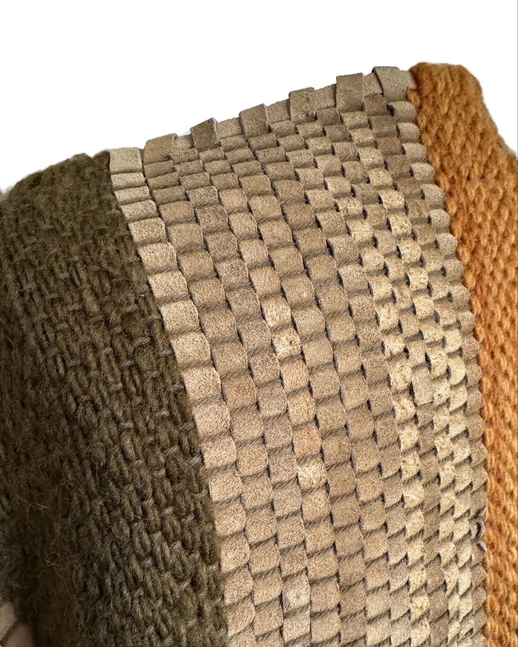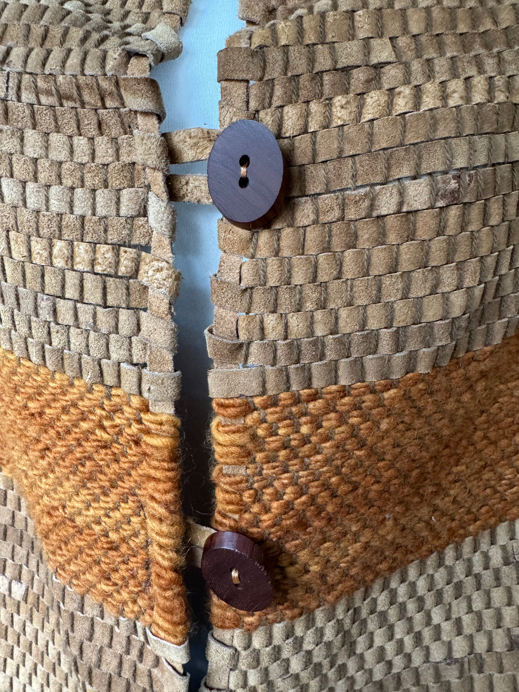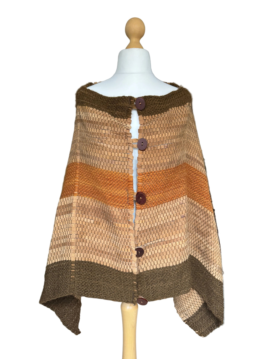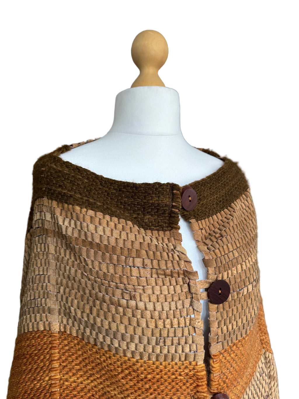 Argentinian wool and suede striped woven poncho. Brown suede strips are interwoven with earthtone rust and army green wool yarn to create this unique and textural poncho. Large dark brown oval wood buttons. Silvertone "Republica Argentina" button attached to the hem.