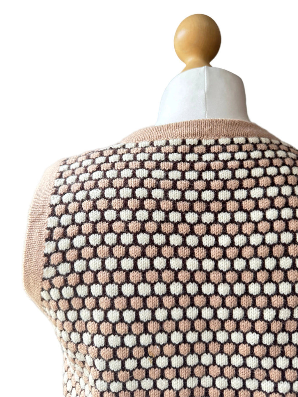1970s beige, ivory, and chocolate-brown textured graphic knit vest. Tonal beige buttons. Unknown yarn content, but likely synthetic. Soft hand feel.