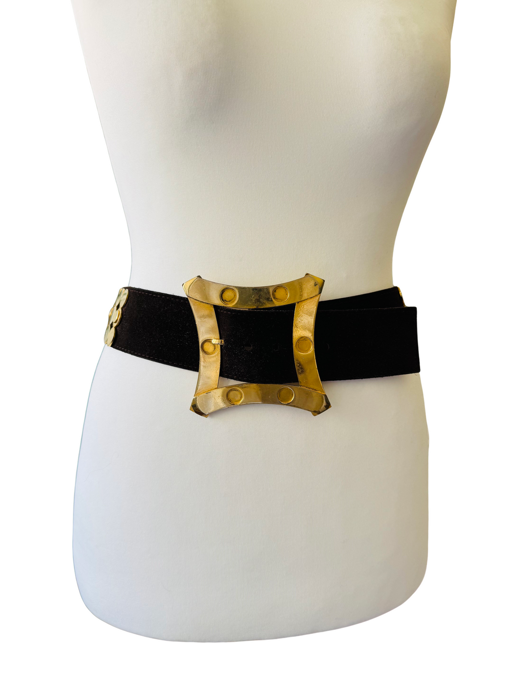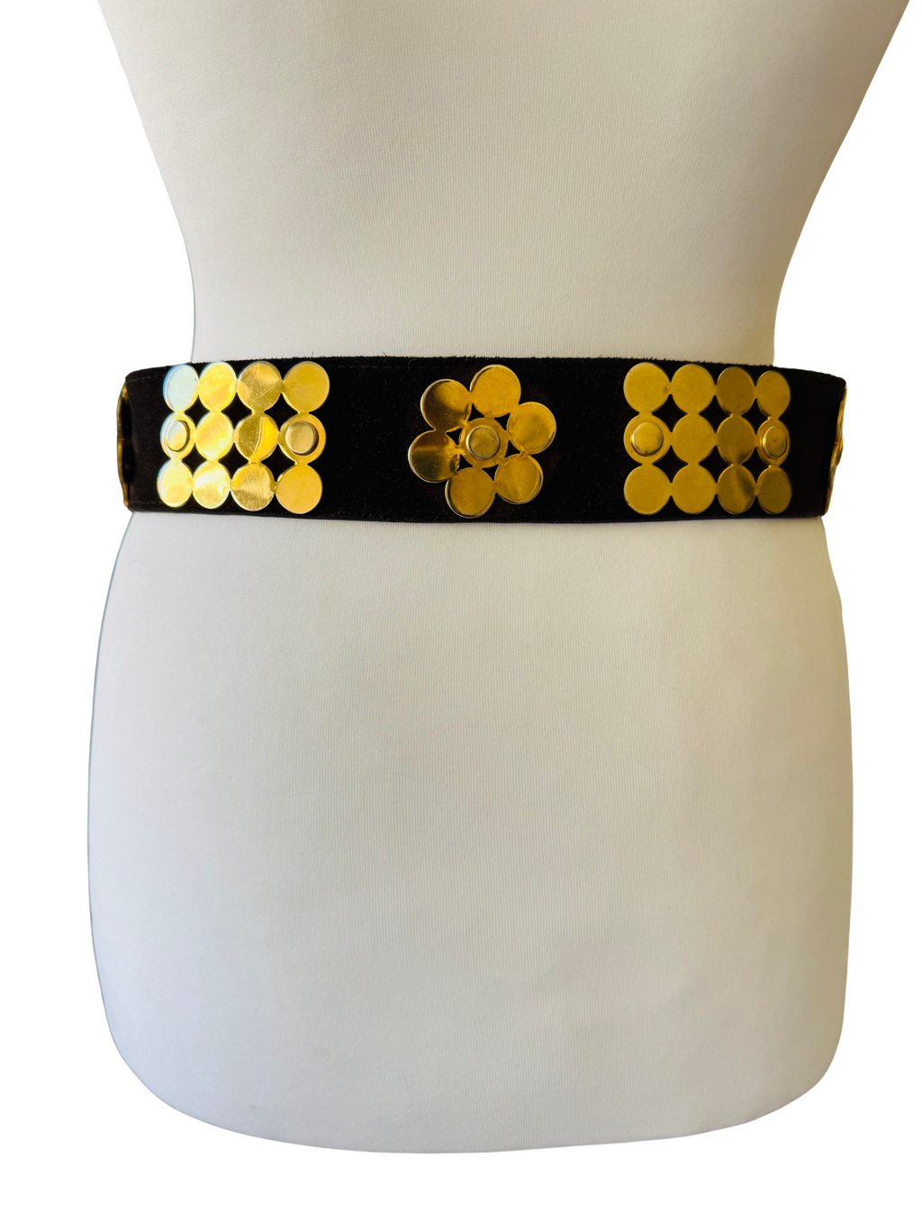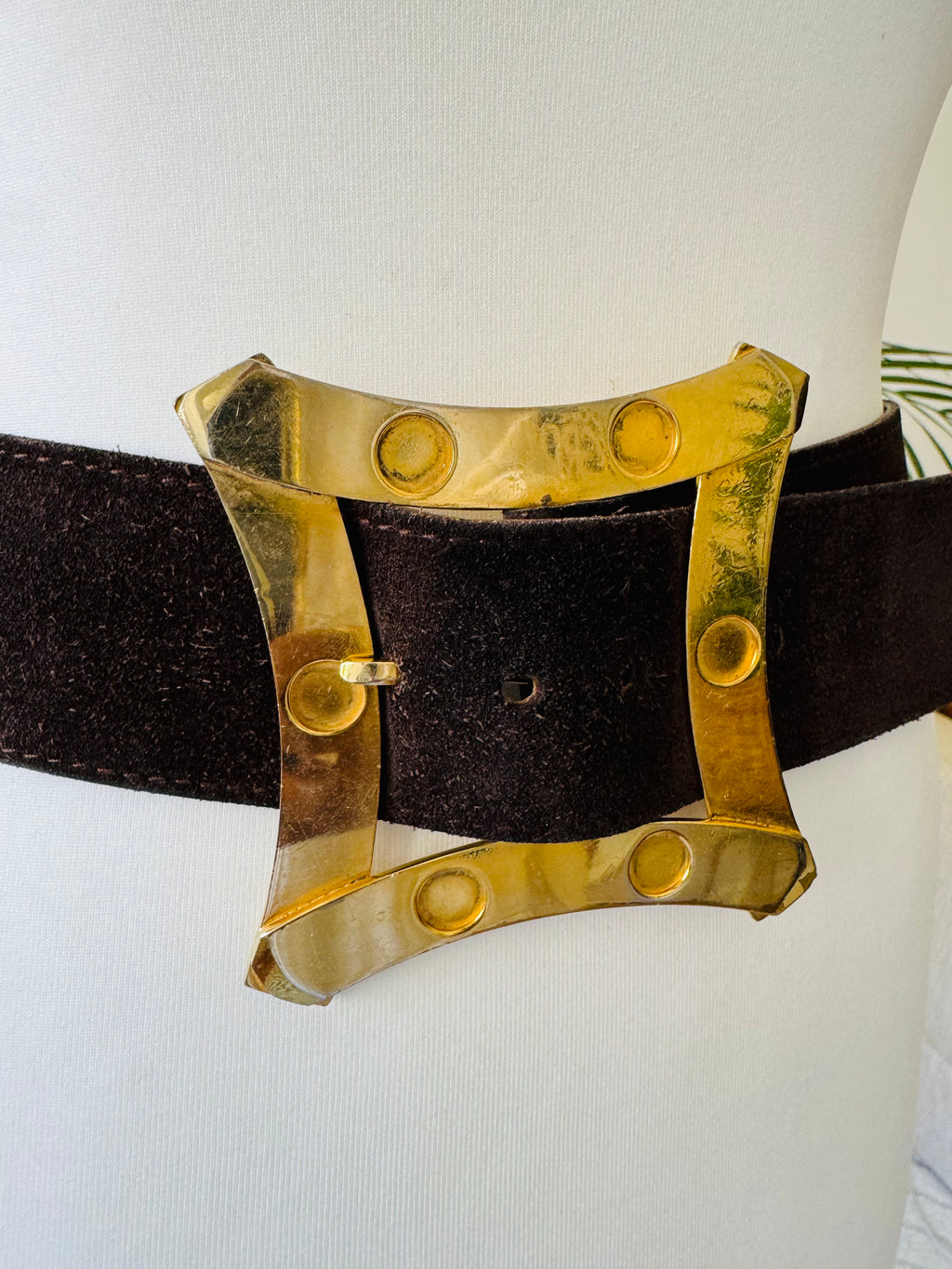 1970's dark brown wide suede leather belt. Large shiny goldtone buckle and large scale floral/geometric studded elements. Heavy weight/high quality hardware.