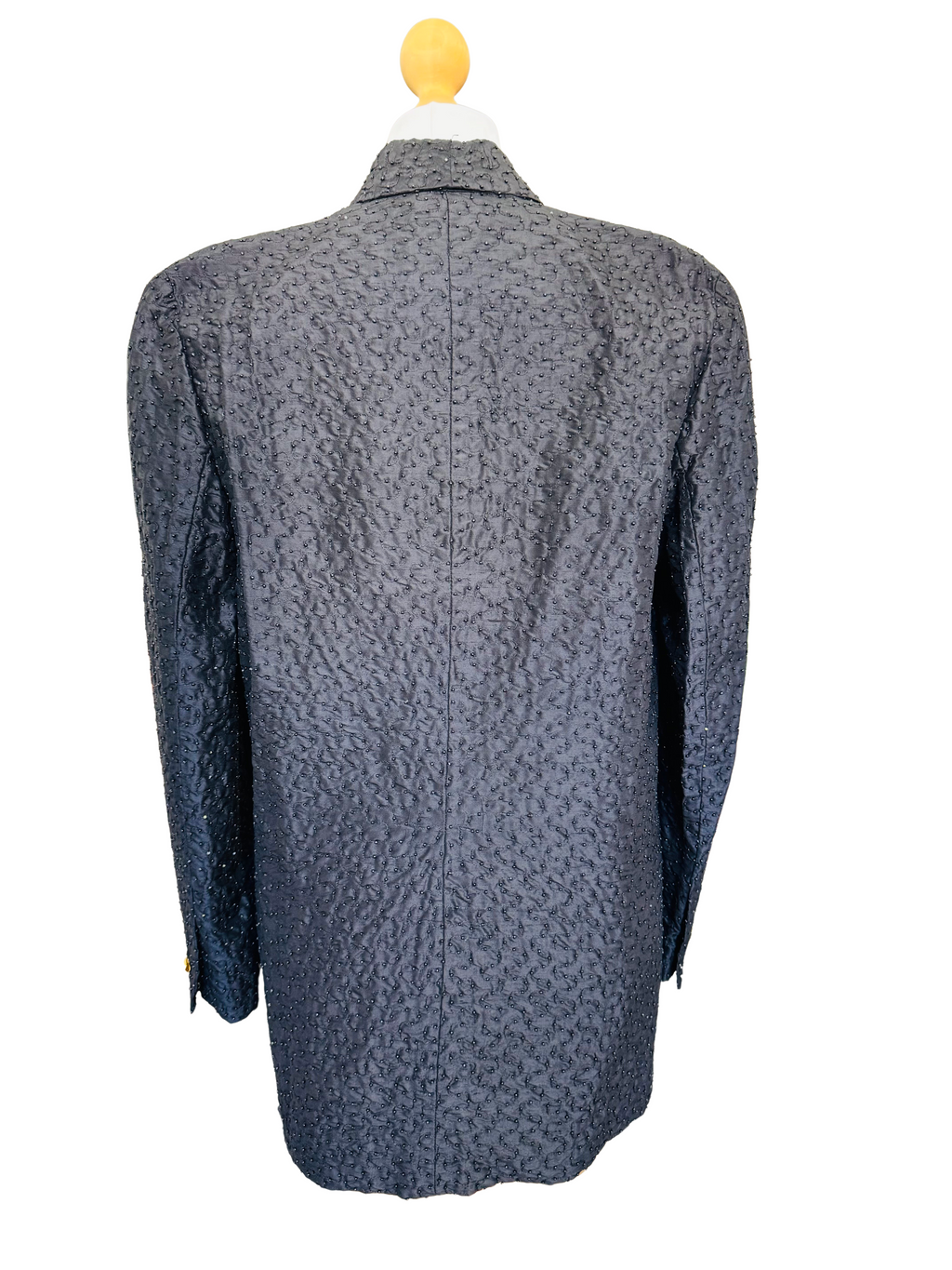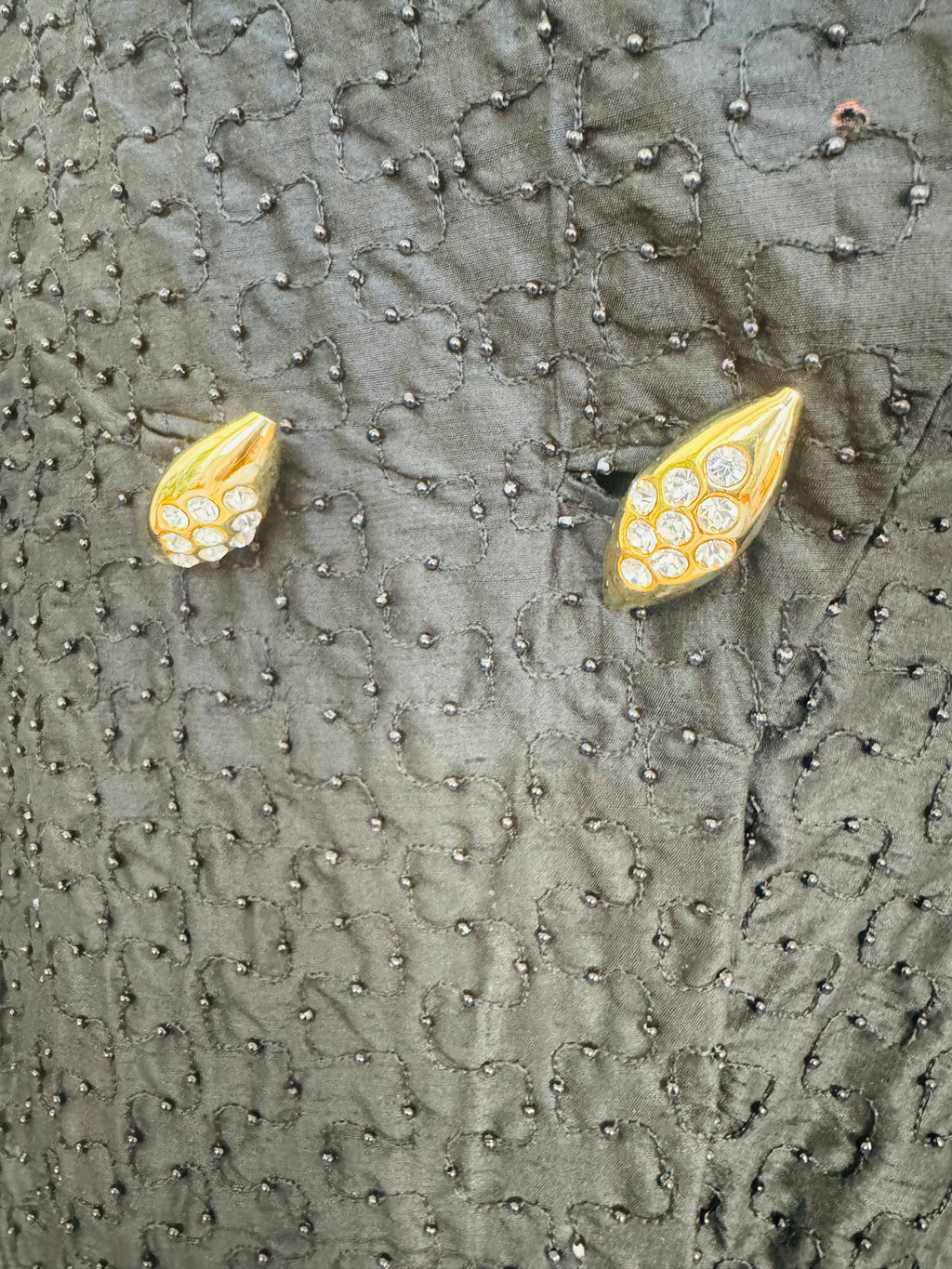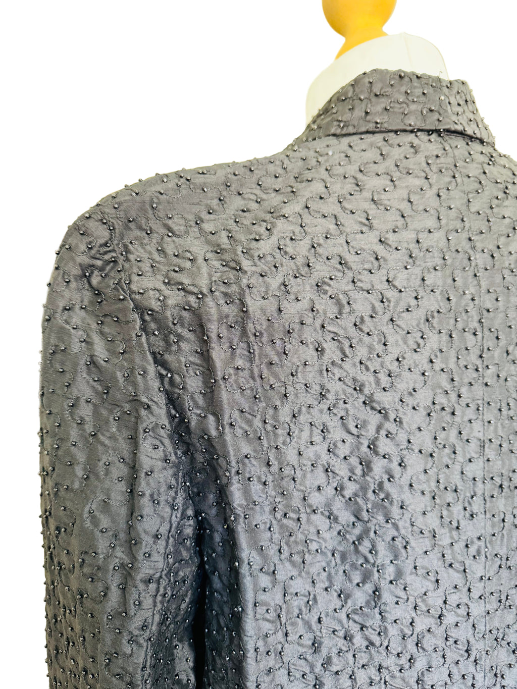 1980's/90's black silk shantung blazer with black vermicelli beading and goldtone pave crystal buttons. Very slight shoulder pad. Fully lined. Double breasted closure. 100% silk body.