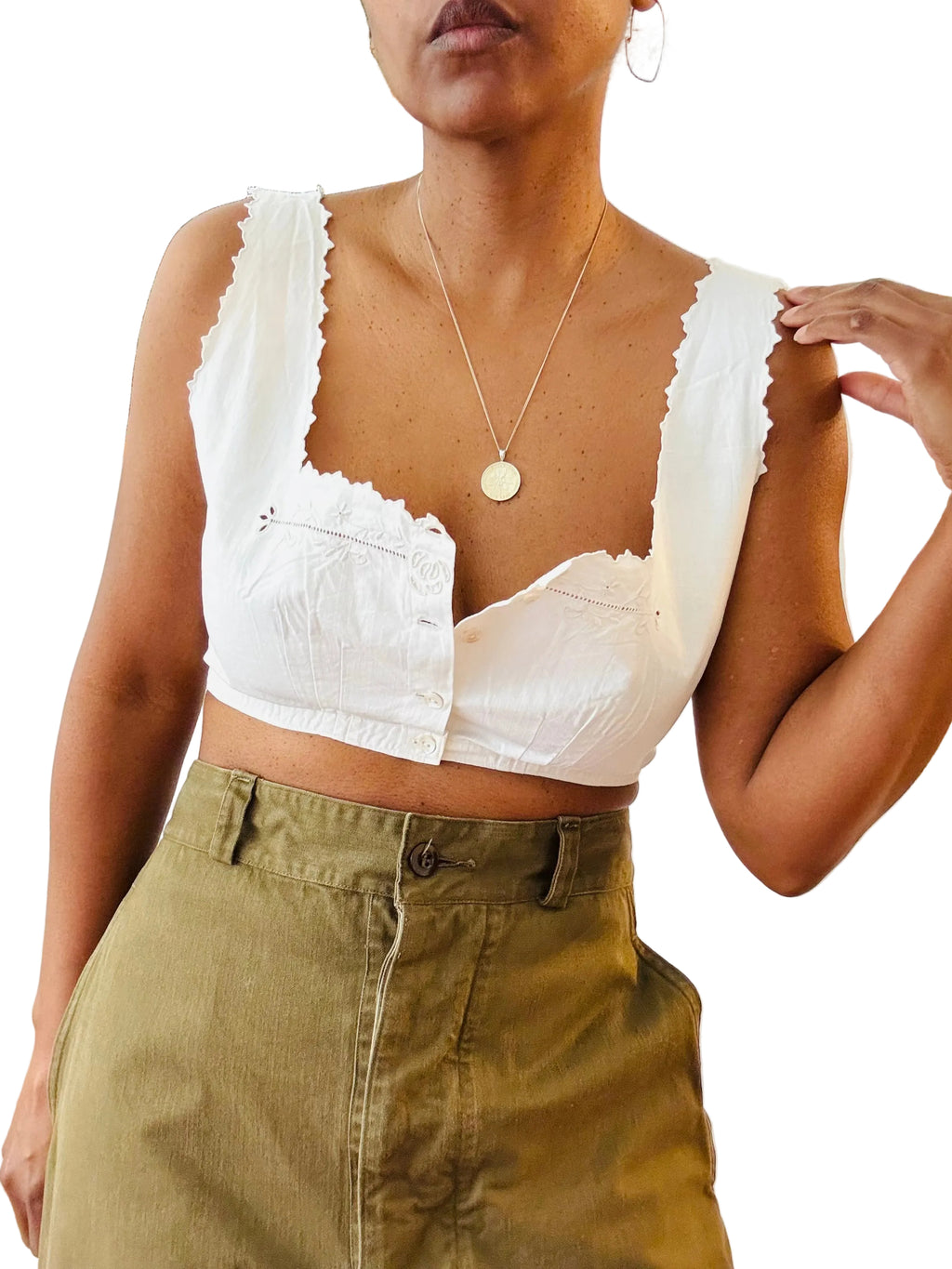 Vintage early-1900s white cotton-embroidered cropped bra top. Eyelet embroidered bodice. Button down front with shell buttons—100% cotton.