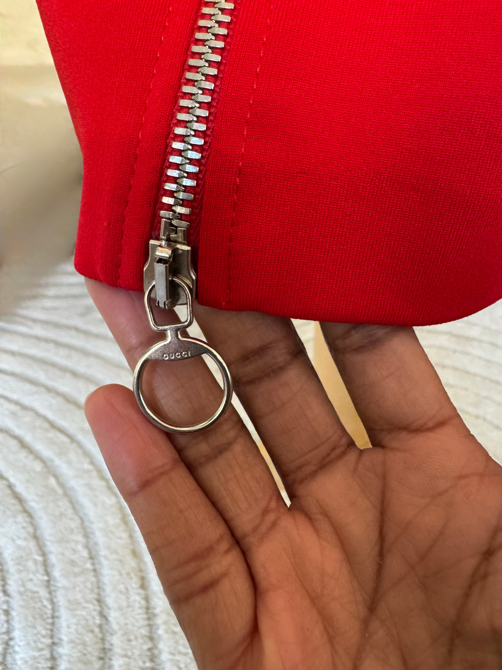 Gucci knee-length red jersey zip front dress. Silver zipper detail allows you to zip dress down to create a plunging neckline or zip up to create center front slit. Webbed ribbon at neck can be tied in a bow. Striped waistband detail. 75% viscose/17%polyamide/8% elastane. Made in Italy.