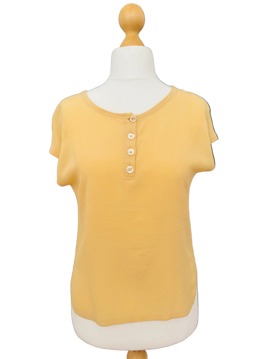 Valentino Miss V pale yellow crinkled silk crepe cap sleeved blouse. Center front button placket. Ivory shell buttons. Made in Italy. 100% silk.