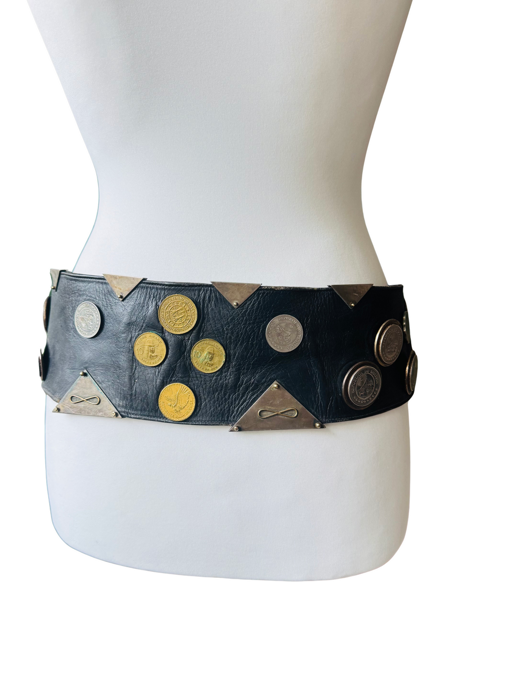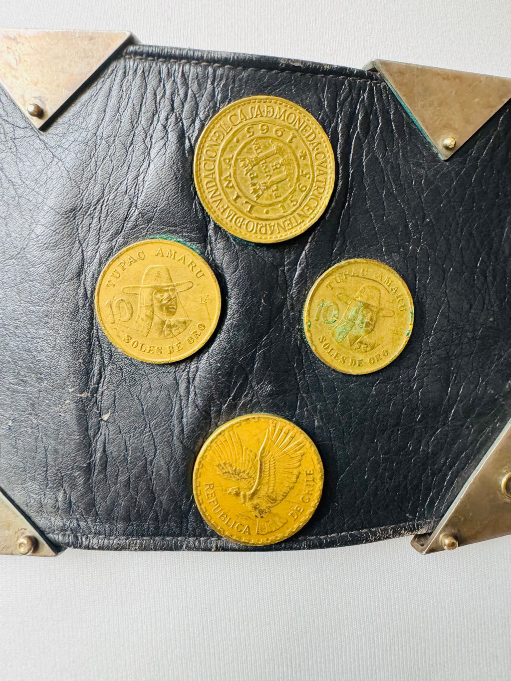Vintage black leather gaucho rodeo belt with South American coins. Wide leather belt is adorned with coins from Bolivia, Argentina, Chile and Peru. Heavy Weight. Leather, brass, nickel, silver.
