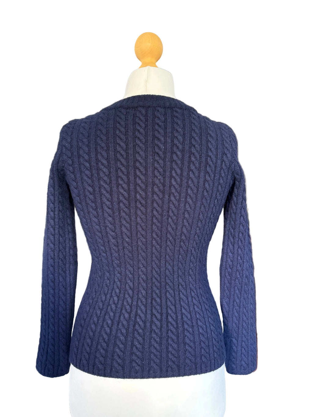 Navy blue wool Yves St. Laurent fitted cable knit cardigan. V-neckline. Matching navy buttons. Heavyweight and warm knit.